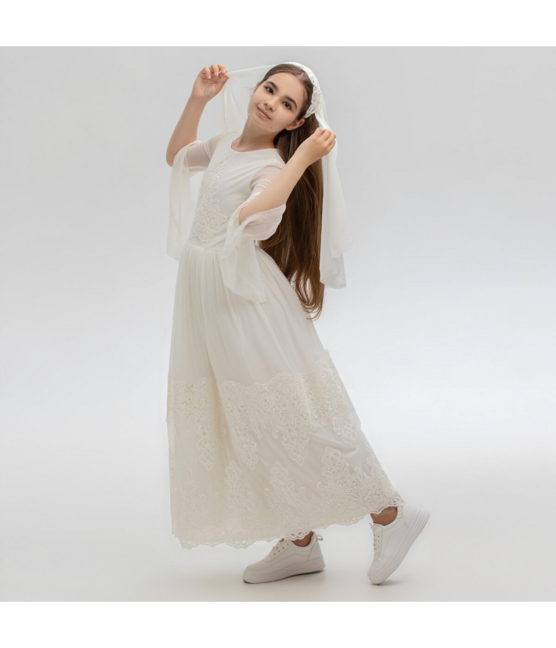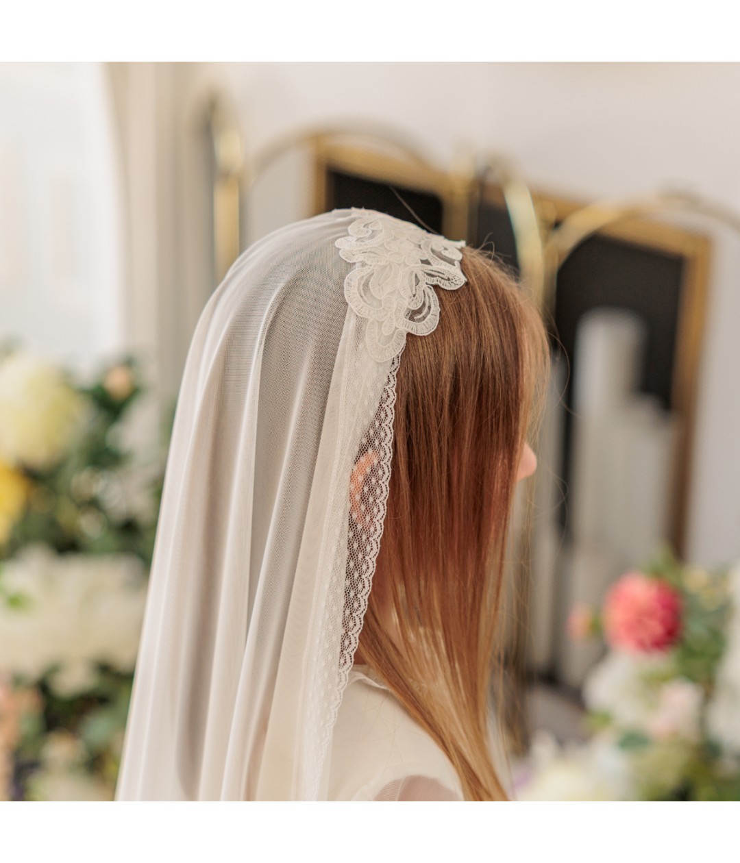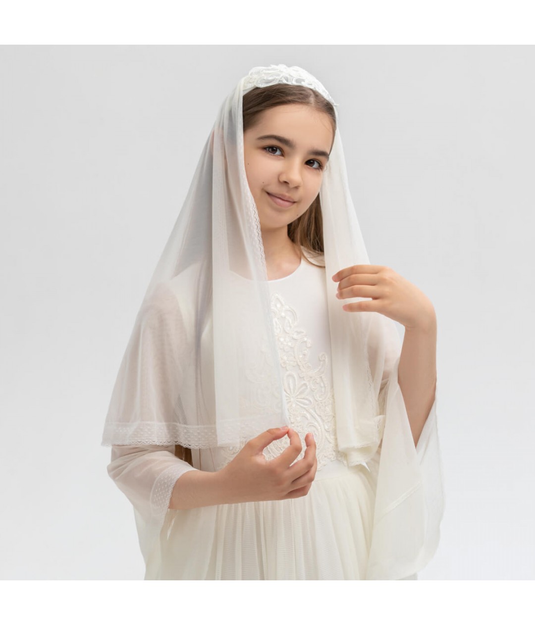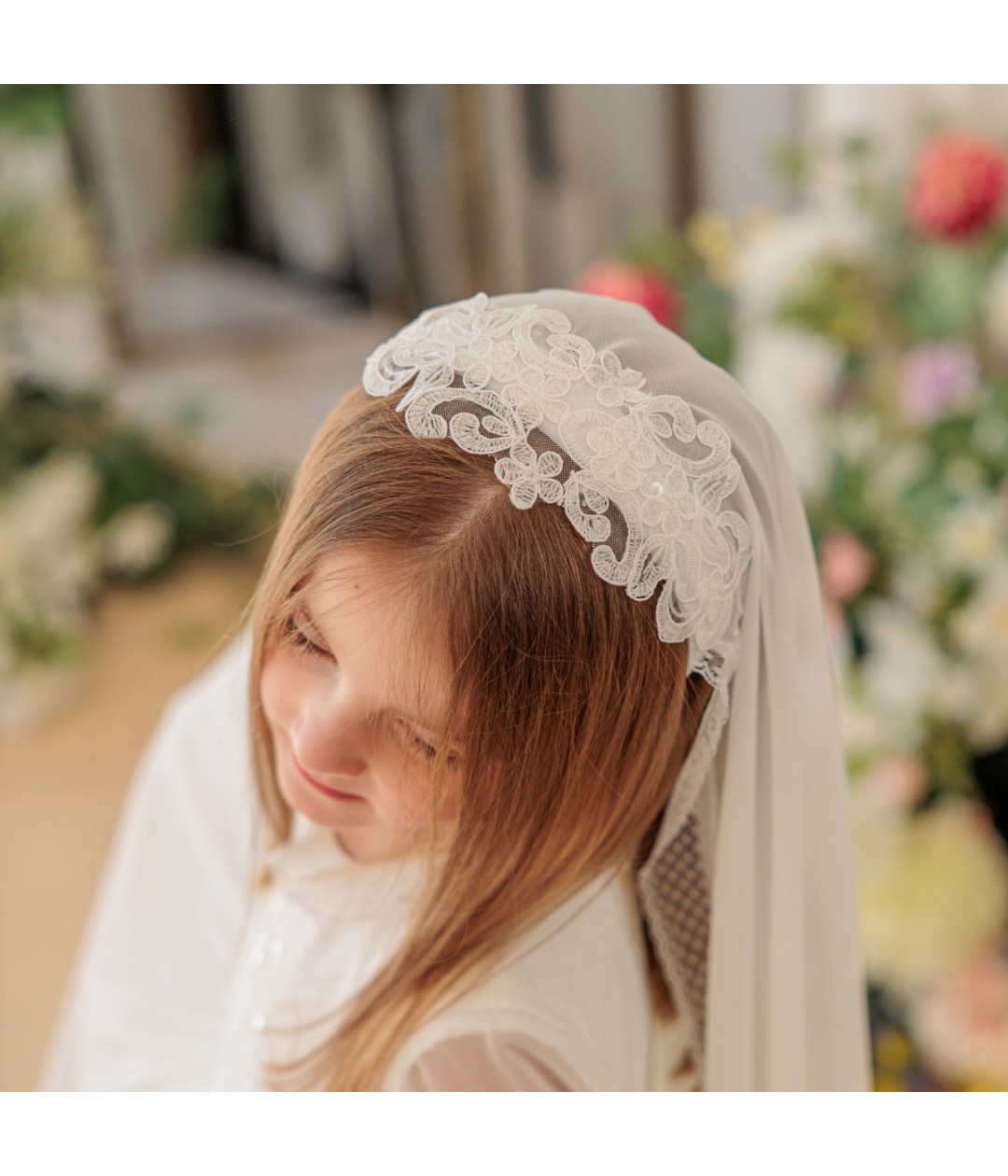 The attached flowing tulle veil adds graceful charm, with its edges completely trimmed in elegant lace to match the design. Whether you're pairing it with a traditional gown or a modern communion dress, this veil completes the ceremonial look effortlessly.
